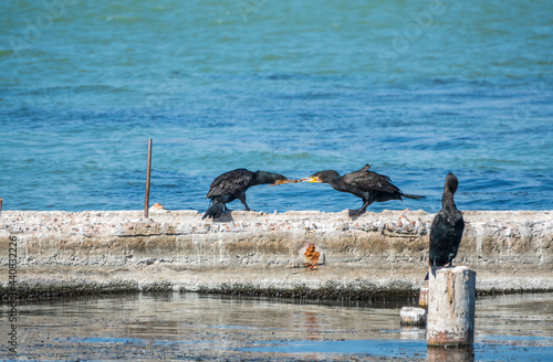 Two cormorants are pulling a stick. Two cormorants are playing on the dock.