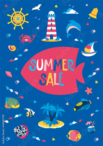 Summer sale poster with marine symbols: fish, yacht, steering wheel, bell, island. Sea life. Vector illustration, flat, background, poster, print, banner, flyer, invitation