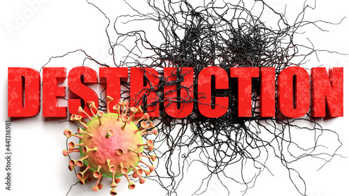 Degradation and destruction during covid pandemic, pictured as declining phrase destruction and a corona virus to symbolize current problems caused by epidemic, 3d illustration