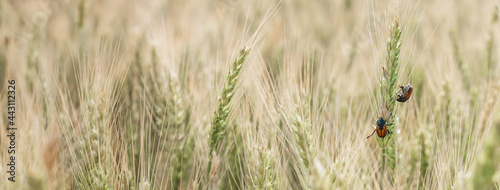 Bread Beetle eats wheat ear. Insect pest of crops Grain Beetle close-up.