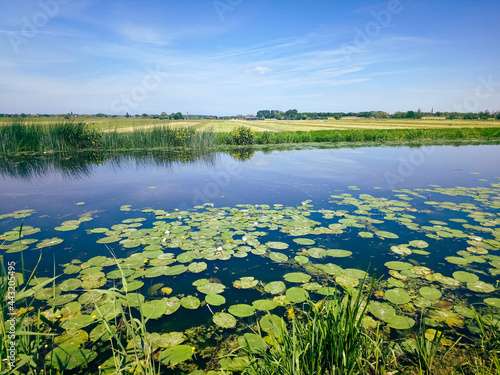 Typical image of the Dutch polder landscape with its green meadows and ditches in summer