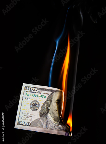 conceptual image of half a hundred dollar bill burning with a bright flame on a black background
