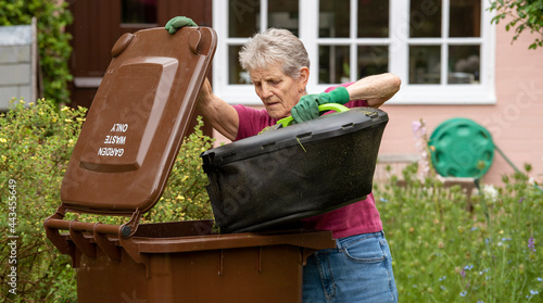 Hampshire, England, UK. 2021. Woman emptying grass cuttings into a garden waste brown wheelie bin.