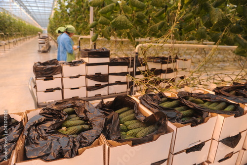 Workers take care of plants and fruit bushes in a large greenhouse.
