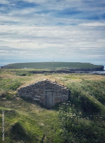 Fisherman Hut at Skiba Geo with Brough of Birsay in the distance.