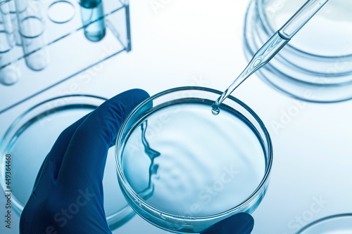 closeup of researcher's hand holding a culture dish and pipette with liquid for scientific research.