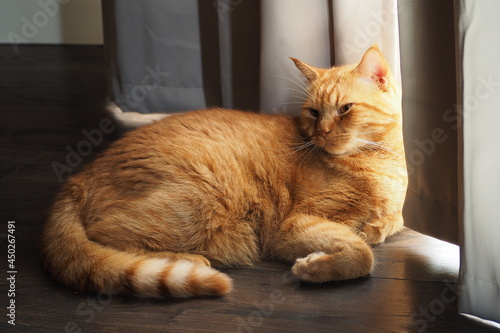 Rudy puchaty kot leżący na podłodze przy szarej zasłonie