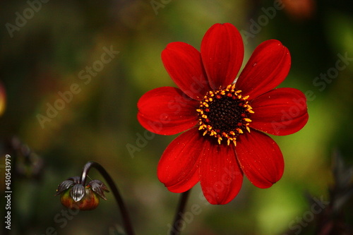 Close-up of Dahlia flower 'Mystic Enchantment', blurred background.