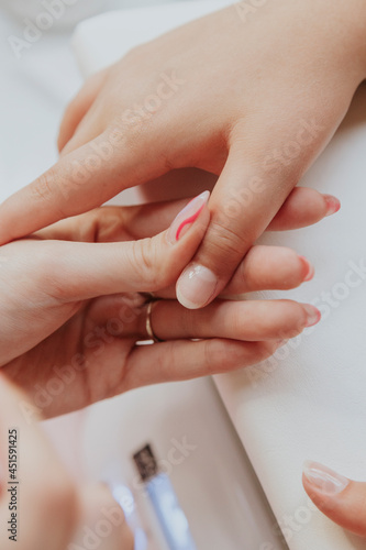 Manicurist , hands closeup. Professional manicure in beauty salon. Hygiene and care for hands. Beauty industry concept.