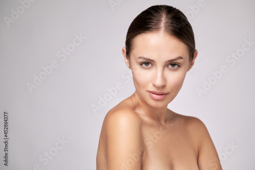 Beautiful Young Woman with Clean Fresh Skin standing over light grey background