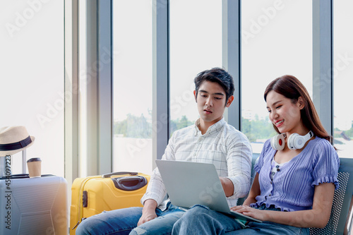 Asian young traveler lover couple siting on terminal chair seat with luggage suitcase, using laptop computer together, talking having and having fun times, happy friend traveling on vacation.