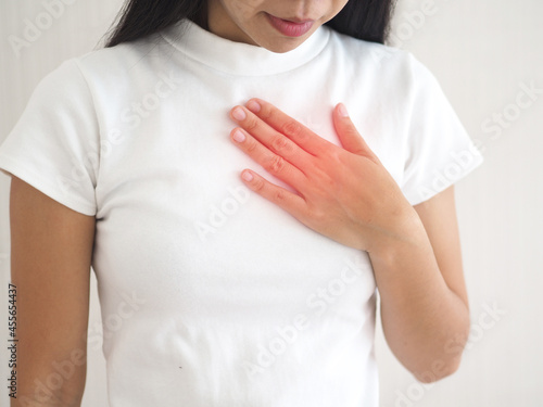 Young woman touching chest. Heart attack, heart disease, and chest pain concepts, on white background. closeup photo, blurred.