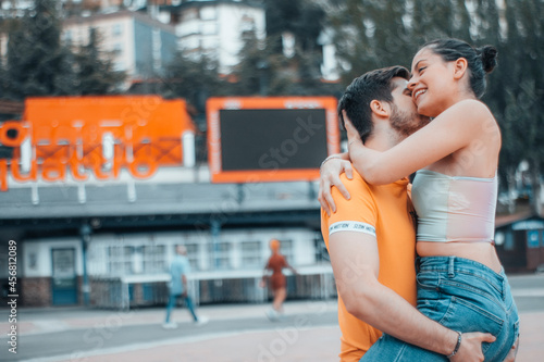 Muchacho y joven chica besándose abrazados en una plaza de la ciudad junto a los arboles y la naturaleza