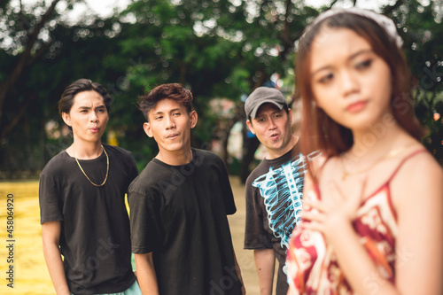 Three rude men catcalling and making provocative gestures to a nervous lady while trailing her from behind. Street harassment concept.