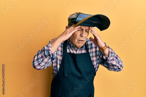 Handsome senior man with grey hair wearing welding protection mask with hand on head for pain in head because stress. suffering migraine.
