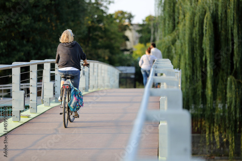 Kobieta jedzie na rowerze po moście we Wrocławiu.