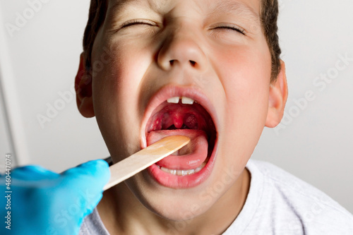 The boy's mouth is wide open with tonsils are enlarged, visible in the white or yellowish tinge on a gray background. Pediatrician checking 8-aged schoolboy's throat applying wooden spatula.