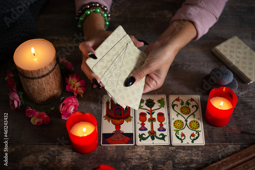 Fortune teller reading a future by tarot cards on rustic table