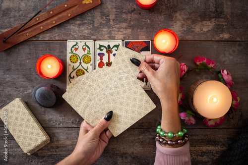 Fortune teller reading a future by tarot cards on rustic table