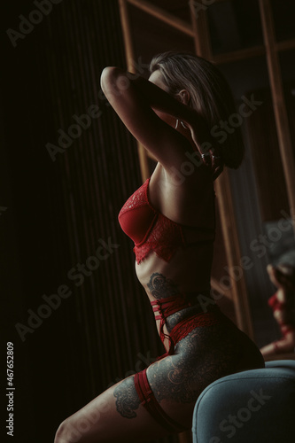 Attractive and elegant beautiful young woman with perfect slim hot body posing in sexy red underwear