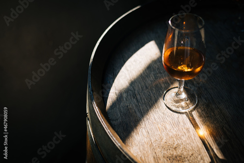 Glass of Porto wine on a wooden oak barrel with long shadow in moody atmosphere