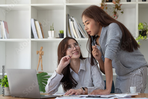 Two asian woman colleagues working together, have a disussion, using laptop computer at office with financial document on desk