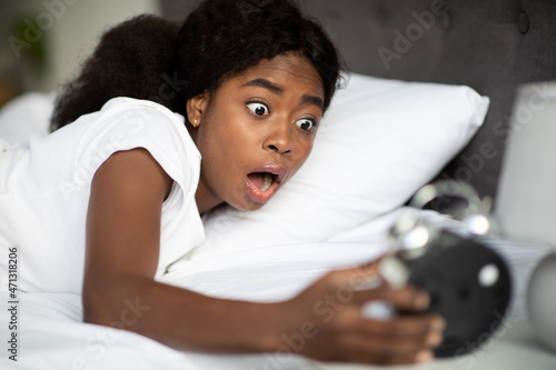 Woman hold big black clock on bed in bedroom at home. She shock after wake up too late for appointment or work or class study.