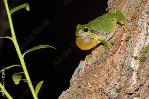 croaking male of European tree frog (Hyla arborea) on tree trunk during night