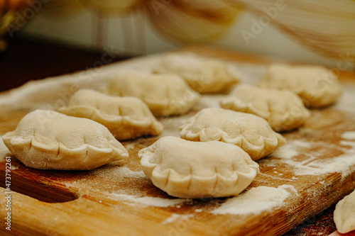 gotowe pierogi śmietana koperek jedzenie w trakcie pracy robienia przygotowanie lepienie polskie ręcznie robione