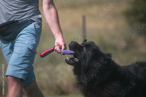 Czarny pies chwytający zabawkę z ręki przewodnika