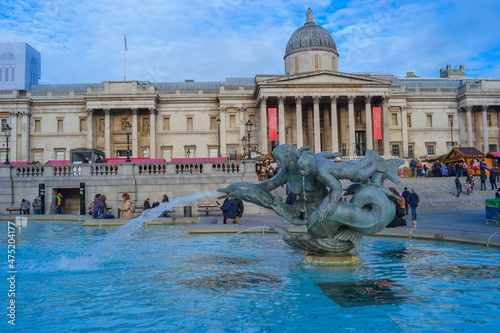 UK, London, 11.12.2021: Trafalgar Square. View to the National Gallery through famous fountain with fairy sculptures