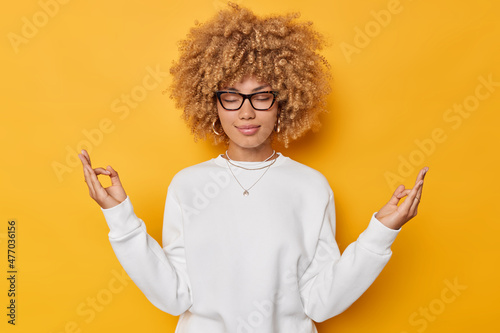 Portrait of beautiful woman with curly hair practices yoga indoors holds hands in mudra gesture keeps eyes closed fingers together wears white jumper isolated over yellow background breathes deeply