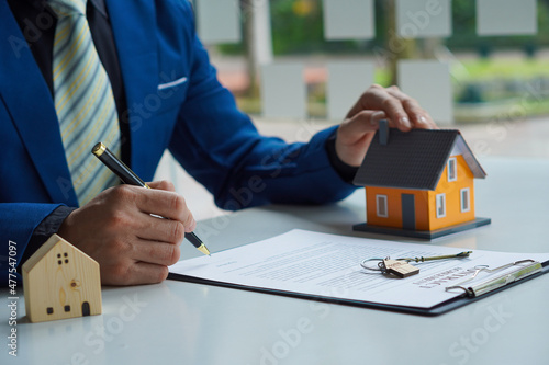 A real estate agent holds a small home and delivers it to the customer after the contract is complete in agreeing to buy a home and lease the concept.