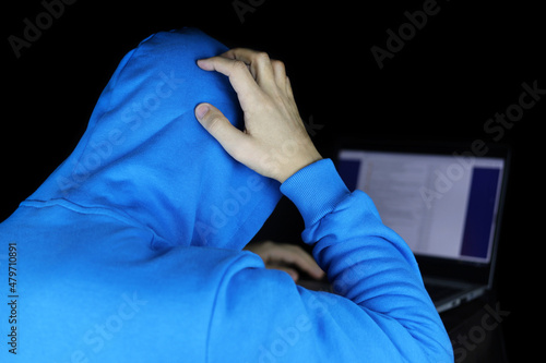 Man in blue hoodie sitting with laptop scratching his head. Concept of cybercrime, hacking or difficult task