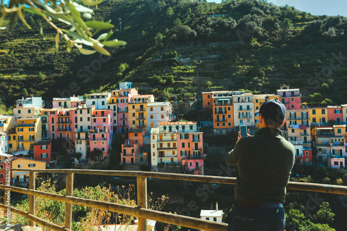 Selective focus on mobile phone, ataking photo at panoramic view of Riomaggiore colorful village, Cinque Terre, Italy