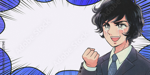 レトロな熱血漫画風・歓喜する会社員のイラストバナー