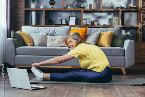 Senior gray-haired woman doing fitness at home sitting on a mat, online aerobics classes, doing stretching, looking at laptop screen