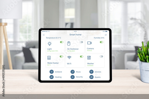 Tablet with smart home app on home desk. Concept of home automatization conrol app with frequently used devices