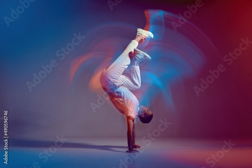 Dancing short hair girl standing on hands in colourful neon studio light. Long exposure. Contemporary hip hop dance