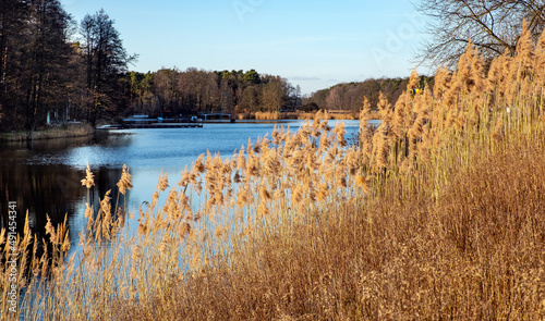 Sunny early spring landscape of wooded swamp at Czarna river and Wilcze Doly nature reserve in Zabieniec village near Warsaw in Mazovia Landscape Park in Poland