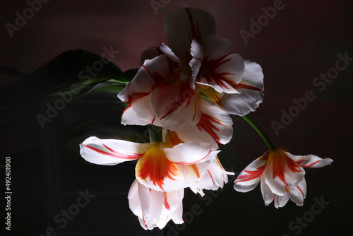Tulipani in primo piano; fiori di colore bianco, rosso e arancio screziato