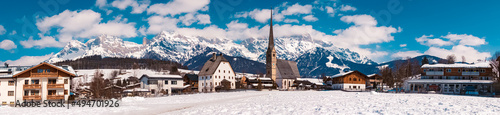 High resolution panorama with a church and the Hochkoenig summit in the background at Maria Alm, Salzburg, Austria