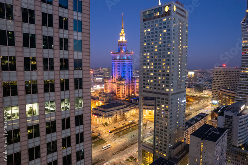 Warszawa, wieżowce nocą, zdjęcia z drona, zachód słońca