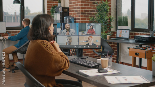 Woman attending business meeting on video call with colleagues to talk about marketing strategy and presentation. Entrepreneur having discussion with workmates on online conference