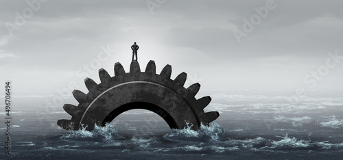 Declining industries and obsolete technology and failing industry concept as a businessman on top of a sinking gear in the ocean as a business faiure symbol