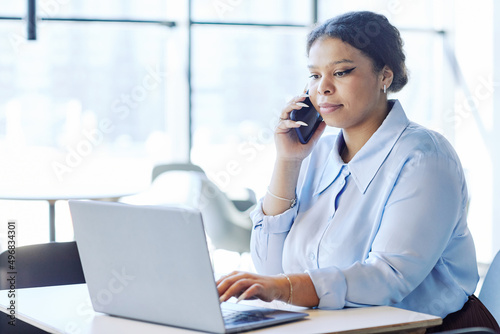 Minimal portrait of young black businesswoman using laptop while working at table in cafe or food court, copy space
