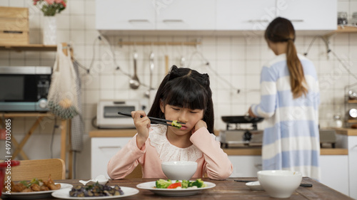 selective focus of unhappy picky Asian schoolgirl daughter holding face with disgust look on face while playing with food in bowl at dining table. her mother is cooking in kitchen at background