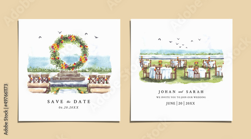 Wedding invitation of nature landscape with beautiful wedding gate view watercolor