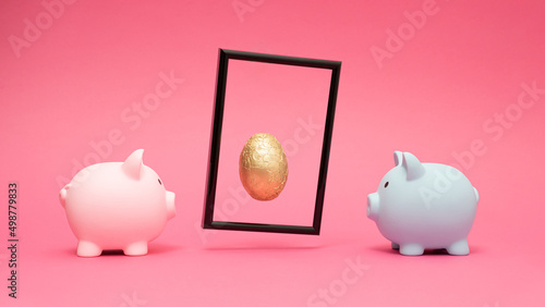 Pastel blue and pink piggy banks with golden egg. Concept of saving, accumulating and preserving money. Love, marriage, marital property composition.