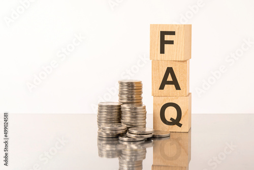 FAQ - Frequency Asked Questions - acronym on wooden cubes on white background with coins
